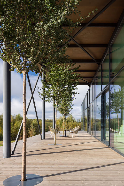 Firstly, it embodies openness — inside the building and on the terrace, one feels directly immersed in nature. Secondly, it emphasizes natural materials: wood, slate, and even more wood.